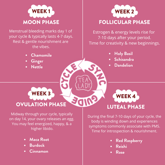 - What if my cycle is irregular? Our cycles are unique to each our bodies, and can fluctuate over time. The Cycle Syncing Set is meant to be taken in alignment with each phase - if you’re unsure, the simplest guide is one powder per week. Tracking your cycle - by noting cravings, energy levels, cervical fluid, PMS symptoms, etc - can help you understand what is "normal" for you. Always listen to your intuition and remember these herbs will be nourishing at ANY time of the month. There is no “wrong” way to consume.